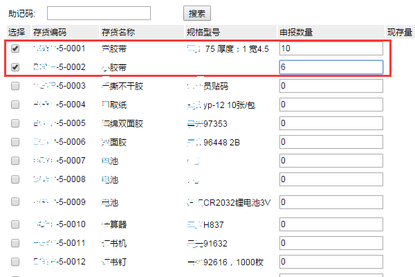 | 根据“请购单”填写的部门、供应商等信息筛选出“存货维护表”的数据,勾选存货,填写申报数量 |