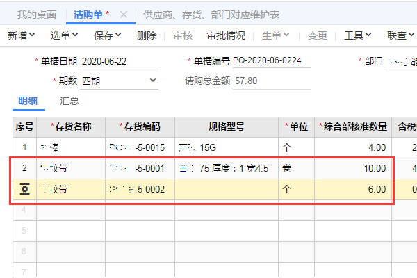 | 配置后的"存货维护表"数据添加到“请购单"的明细中 |