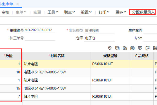 重新分配材料出库单的数量