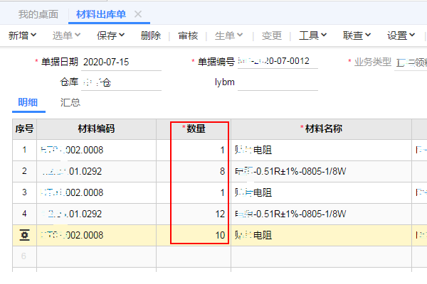 提取材料出库单明细数据,将材料出库单存货明细重新整合排序,修改相应的数量
