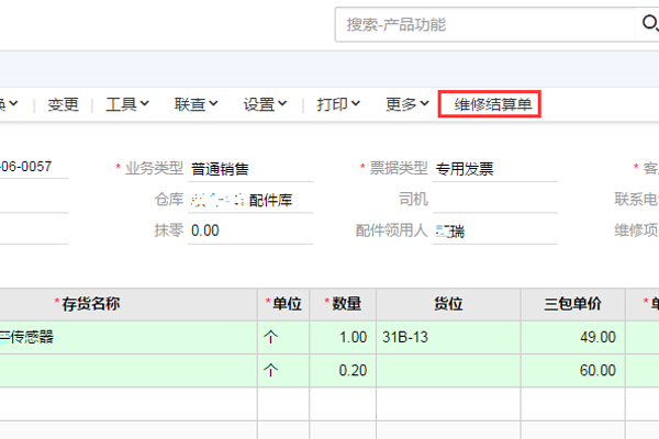 | 在销货单中添加“维修结算单”功能按钮,点击功能按钮生成“维修结算单” |