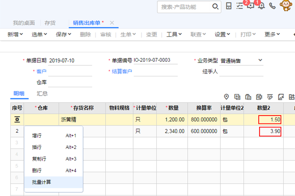 销售出库单的明细中多计量产品进行改变数量重新计算价格。保存时判断明细填写是否合法