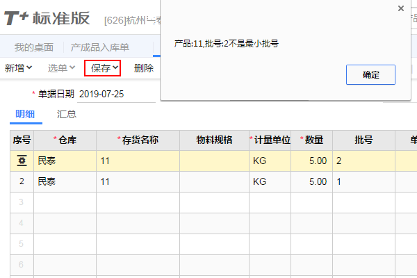 | 材料出库单、销售出库单、其他出库单三张单据进行保存的时候,检测本次出库的物料批次是否为最小的批次,如果不是最小的批次,该单据无法保存。 |