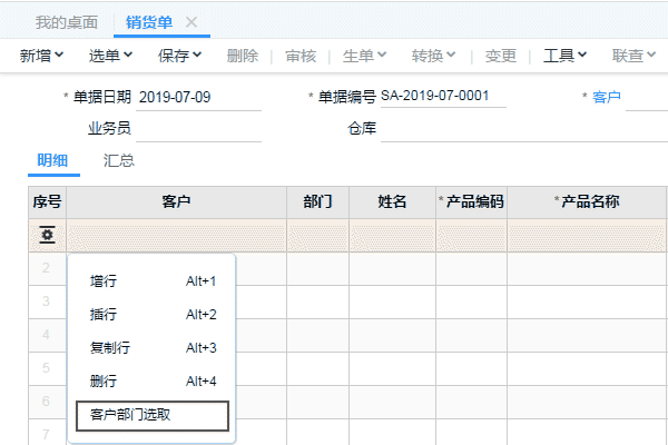| 在销货单的明细列表功能菜单中,添加“客户部门选取”功能 |