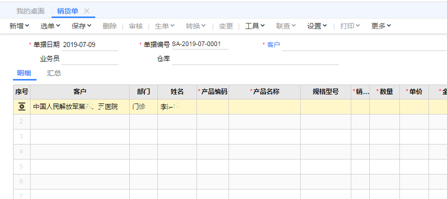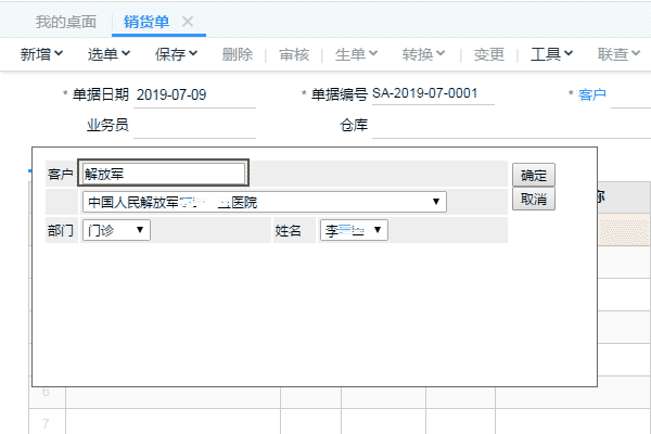 | 将选择的信息填写在明细的客户、部门、姓名对应位置 |