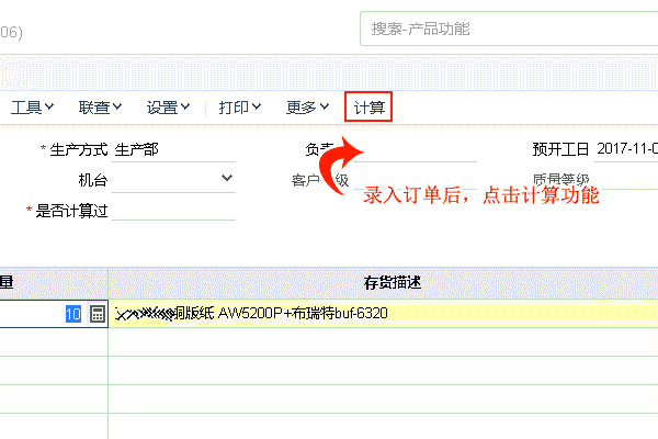| 填写生产加工单,点击“计算”功能,对明细中的现存量进行再计算,并且对子明细中关联的数据,动态调整 |