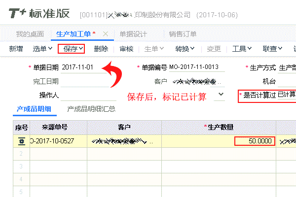 填写订单时,用户对生产加工单的现存量进行再计算,关联明细相应动态调整。并回填订单,标记已“计算”