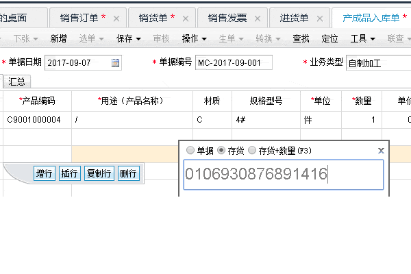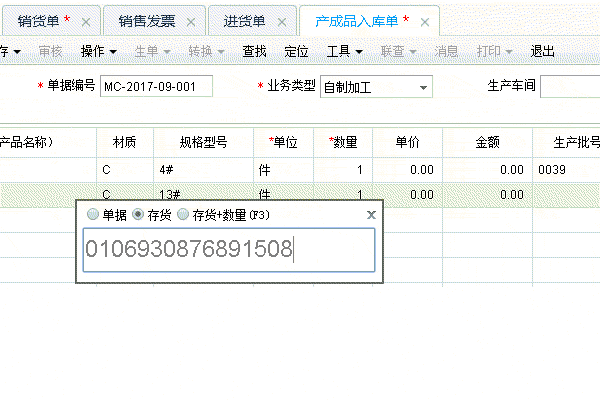 | 用户录入"产成品入库单",工具-条形码录入,添加"存货"选项,修改扫码规则,第一次扫主码,判断位数,筛选出库存信息,添加到明细中 |