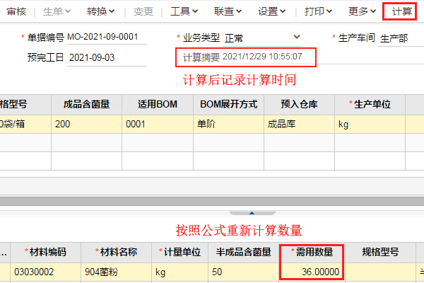 | 填写生产加工单,点击“计算”功能,对材料明细中的需用数量进行再计算。 |